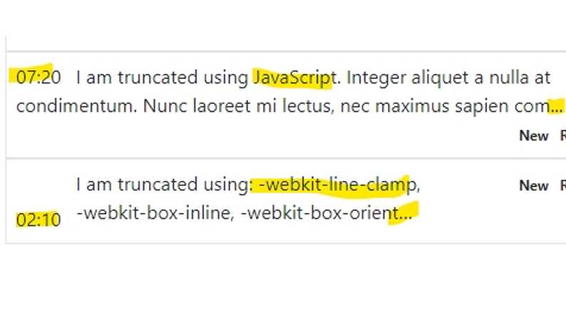 The first item (in the screenshot shown above) is what I wanted. The third line text (New, R) is also inline but aligned right. I would have loved to get the same result by using -webkit-line-clamp (as it's very simple and clean), however, it did not meet my purpose. I had to look elsewhere for the rescue.