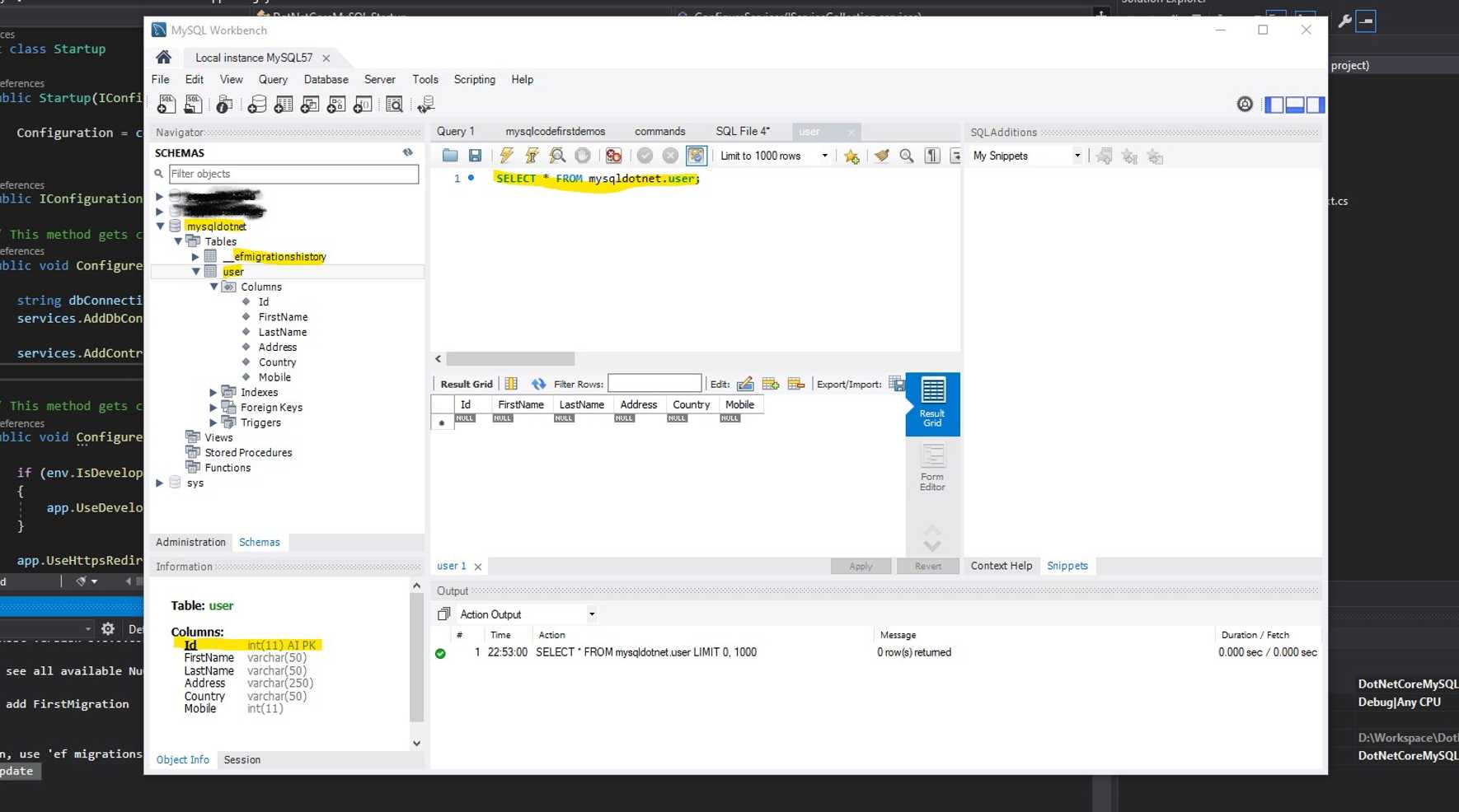 EF creates a folder called Migrations at the root of the project to store all migrations. 2. Apply changes to the database by typing command given below. Remember, MySQL server must be running at this time.